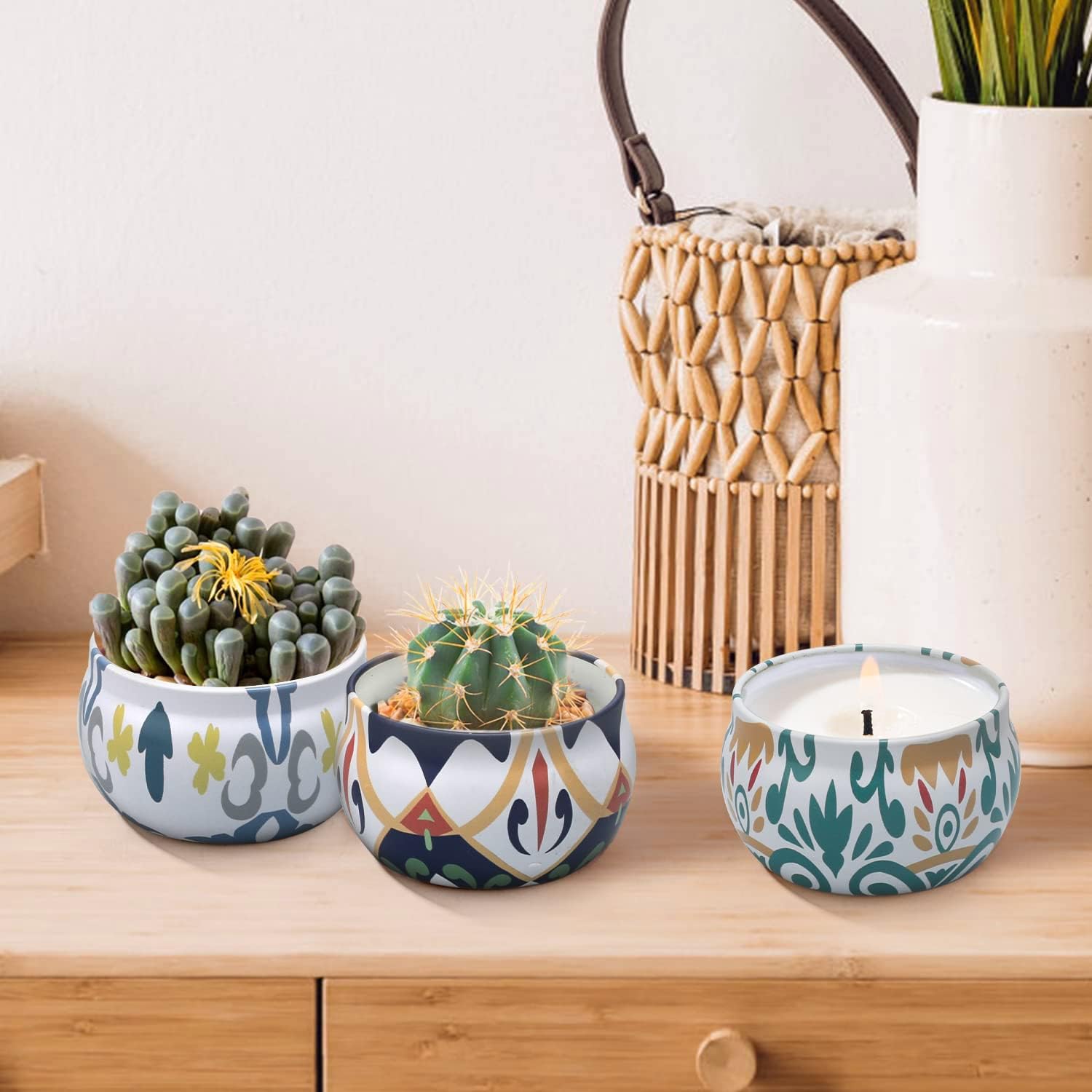 This is an exclusive scented candles gift set with a good price. I am concern that some candles are too strong and might be detrimental to our body. The scent of this particular set is relaxing and will not not overwhelm our senses. The candles are about 2.25″W x 1.5″H inside nicely designed decorative metal containers, they seem small but do last a log time. I used one in the evening for at least 3-4 hours per night and it lasts over 4-5 nights. I did trim the wick a little on the third night though. It seems wasteful to throw away the pretty containers and thus I drilled a small drainage hole at the bottom and planted a succulent. We love it so much and will be getting a set for mom for Mothers’ day.