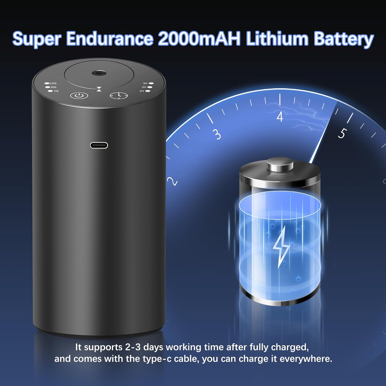 Portable & Rechargeable: Waterless essential oil diffuser features a compact size and can fit well in your car cup holders. Built-in a super endurance 2000mAh lithium battery, it can support 2-3 days working time after fully charged. And it comes with the type-c cable, you can easily charge it and take it anywhere you want to enjoy the aromatherapy.
