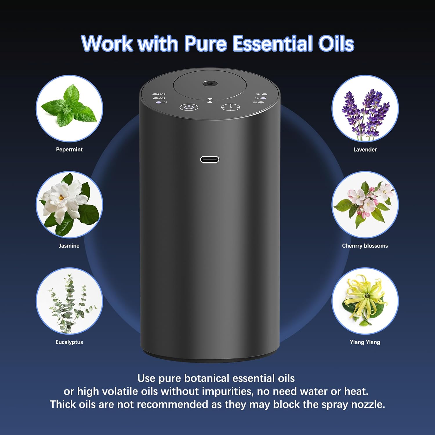 Portable & Rechargeable: Waterless essential oil diffuser features a compact size and can fit well in your car cup holders. Built-in a super endurance 2000mAh lithium battery, it can support 2-3 days working time after fully charged. And it comes with the type-c cable, you can easily charge it and take it anywhere you want to enjoy the aromatherapy.