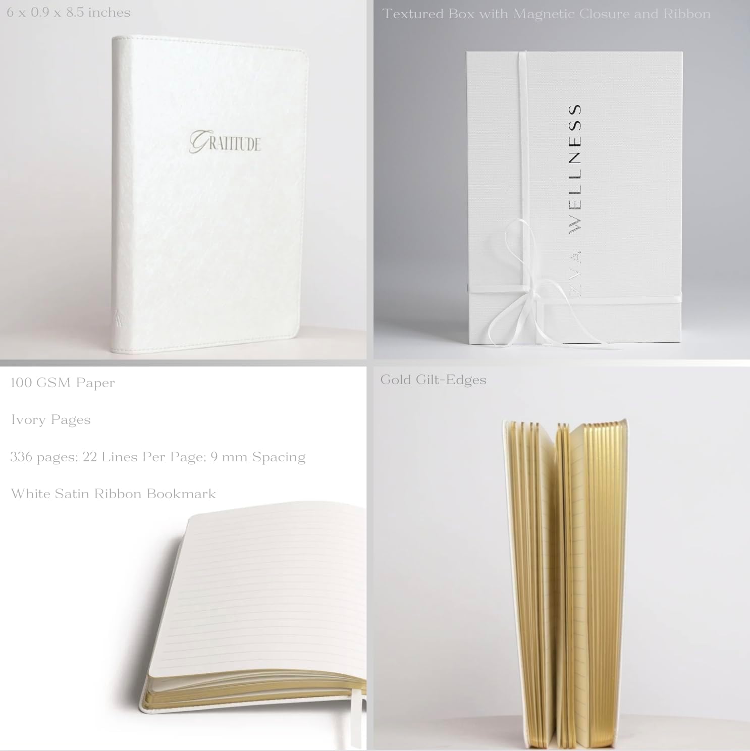PREMIUM QUALITY: Gorgeous and elegant modern minimalist journal for women; high-end aesthetic; pearl-white lustre flexcover; premium faux leather; gold-foil heat-debossed cover title, gold-gilt edges; white satin ribbon bookmark; 336 ruled ivory pages (168 sheets); 100 GSM paper; 9 mm line spacing; 22 lines per page; size: 6 x 0.9 x 8.5; one of a kind customized journal and packaging exclusive to only the ZVA Wellness brand.