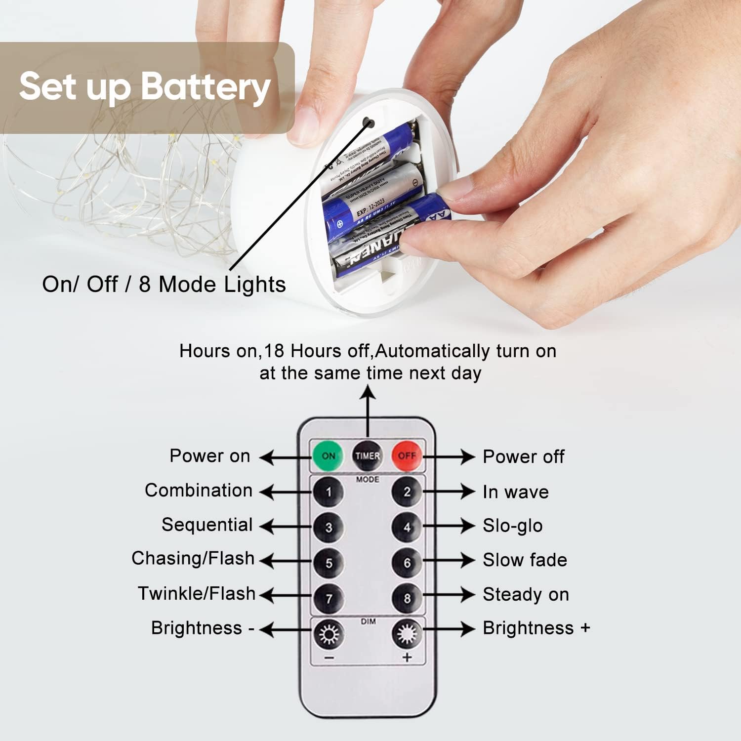 Long Lasting by Battery: Turn on the button of Fairy lights power by 3AA batteies, (Not included) which have 500+ hours of light-time and can be replaced easily via the tab at the bottom. These electric fairy light candles can long lasting though all Halloween and Christmas on the shelf display and closets