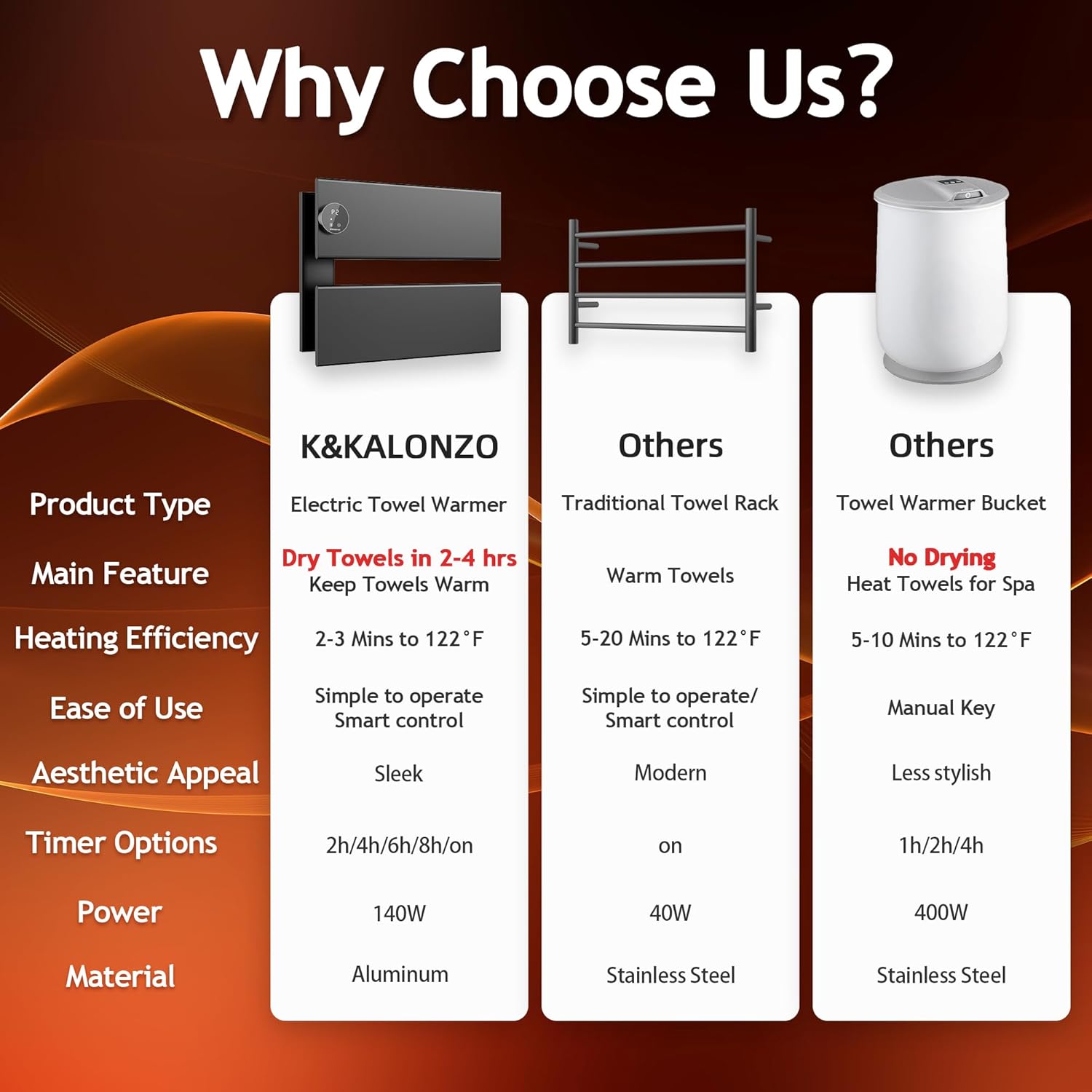 [Premium Aerospace Aluminum Build]: Crafted from aerospace aluminum with delicate construction, K&Kalonzo electric towel warmer combines durability with a sleek, chic design. It’s waterproof and anti-scalding, making it a safe and stylish addition to any space