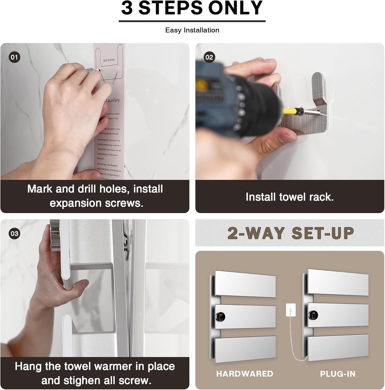 [Easy 3-Step Installation]: Support both plug-in and hardwired installation.Follow the instruction manual, it only takes you 3-4 steps to finish the set-up. Available in various sizes and colors, it’s versatile enough for bathrooms, kitchens, or any area needing quick drying