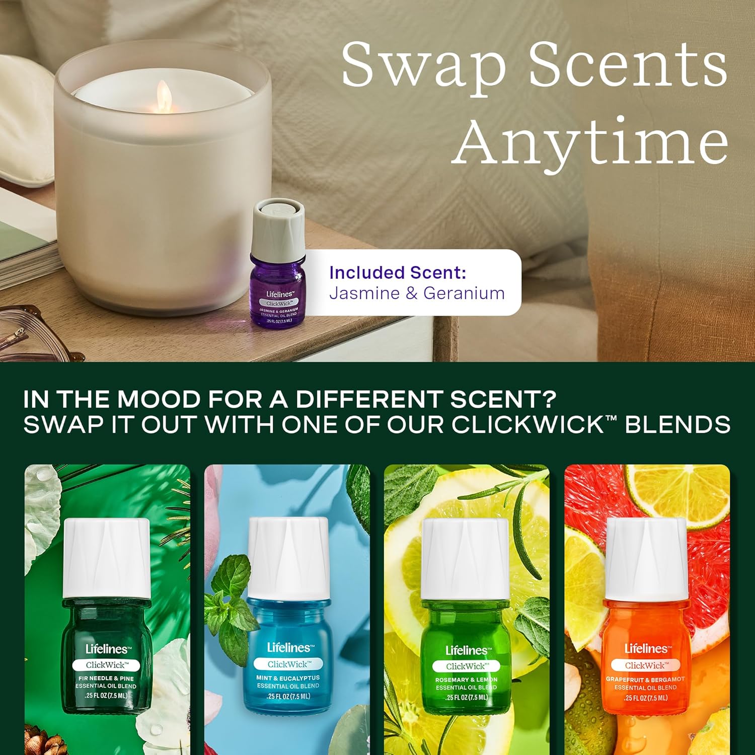 Long-Lasting Jasmine & Geranium Aroma: Diffuses aroma for over 50 hours on a single charge. Insert included ClickWick Essential Oil Blend into the base of the candle and unwind with relaxing mist and a soothing scent.