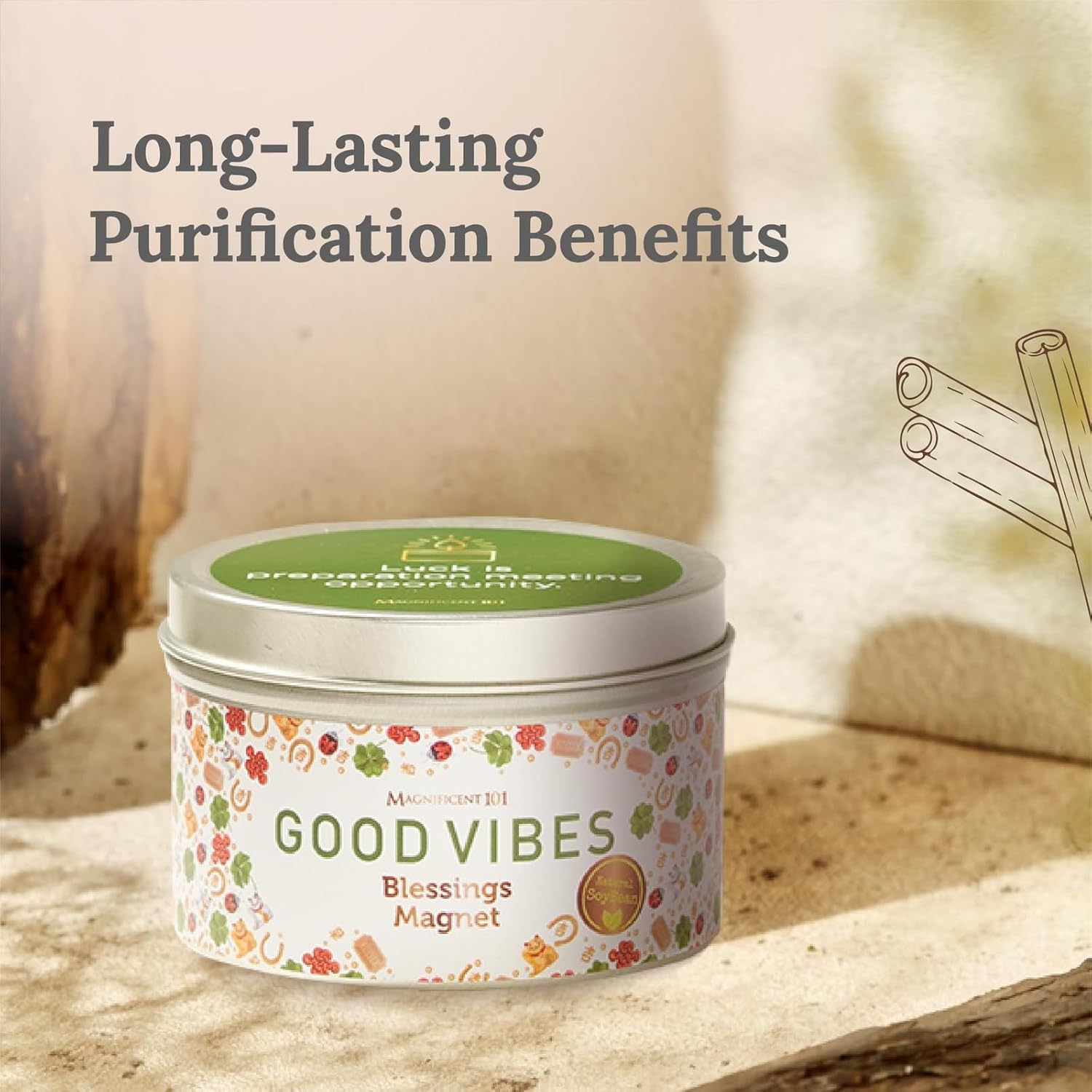 Magnificent 101 Good Vibes Aromatherapy Candle as Blessings Magnet – Sage, Bergamot, Sandalwood Scented Natural Soybean Wax Tin Candle for Purification and Chakra Healing