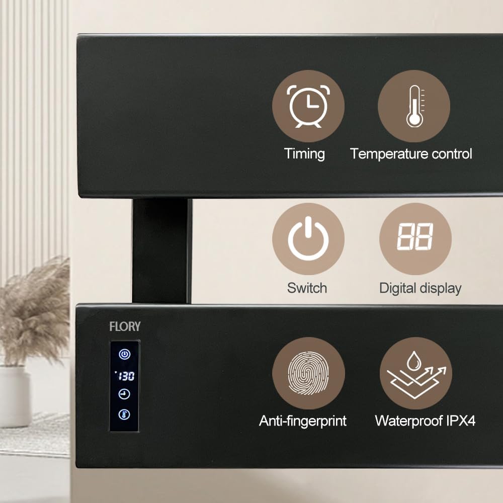 Iâve always wanted an electric heated towel rack. Thereâs nothing worse than reaching for a towel and itâs damp. A heated towel rack is a way to level up your bathroom.Unfortunately, I didnât take into consideration that the outlet is on the other side of the door where we need the towel rack to be installed. The cord isnât one enough to reach the desired installation spot. Itâs my fault since I take the time to figure it out prior to ordering.That being said, this is a fancy looking towel warmer with a sleek and modern design. It has a good weight to it. The finish is matte and is anti-finger-proof and waterproof. Thereâs a digital display with temperature control from 100-140 Fahrenheit and 5 timer options (3H/6H/9H/12H/ON). Recommended. Check desired installation location and outlet first.