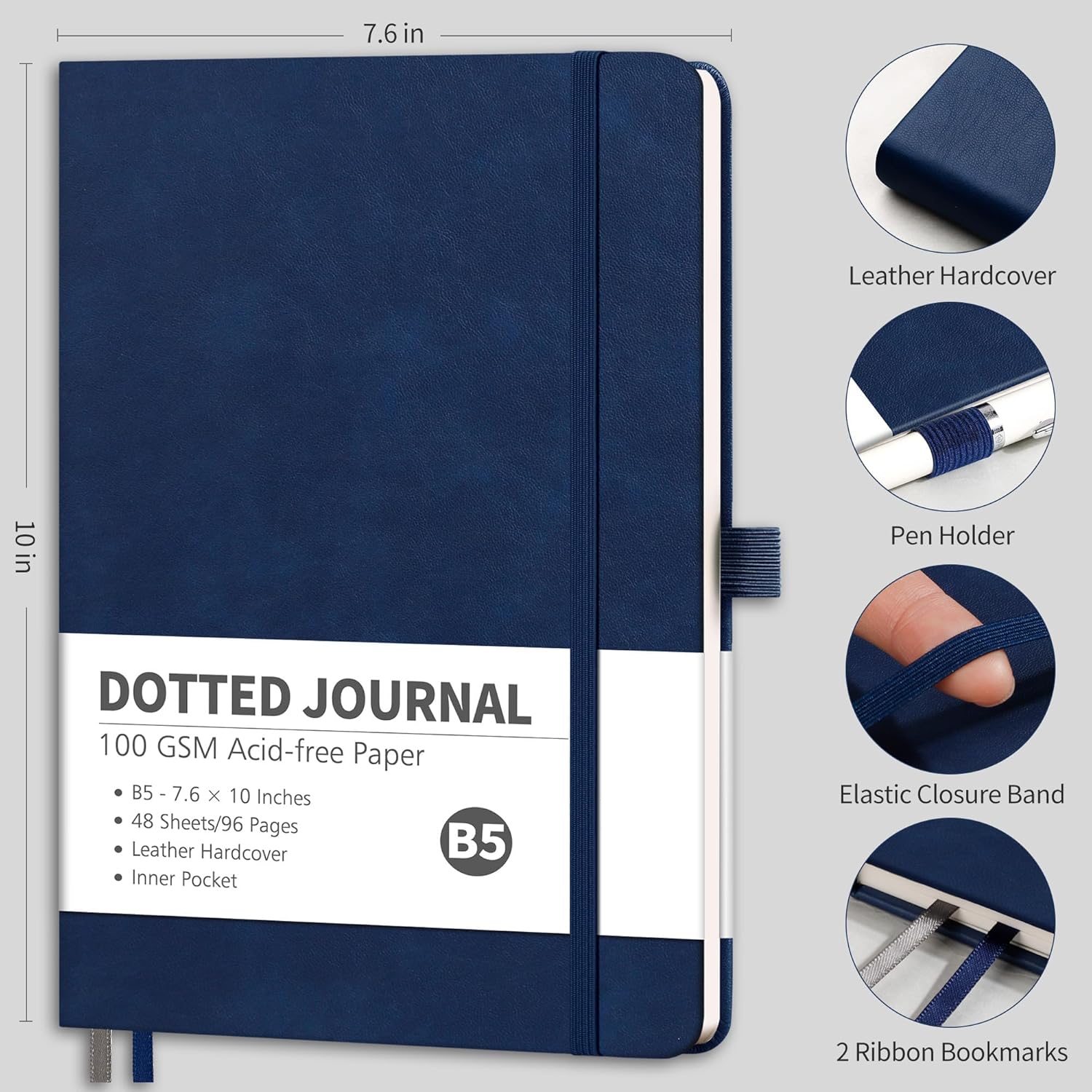 RETTACY Bullet Dotted Journal, B5 Dotted Notebook Journal with 96 Pages, 7.6” × 10”, Medium Size, 100 GSM Thick Paper, Leather Hardcover, Bullet Journaling, Planning, Tracking (Navy Blue)