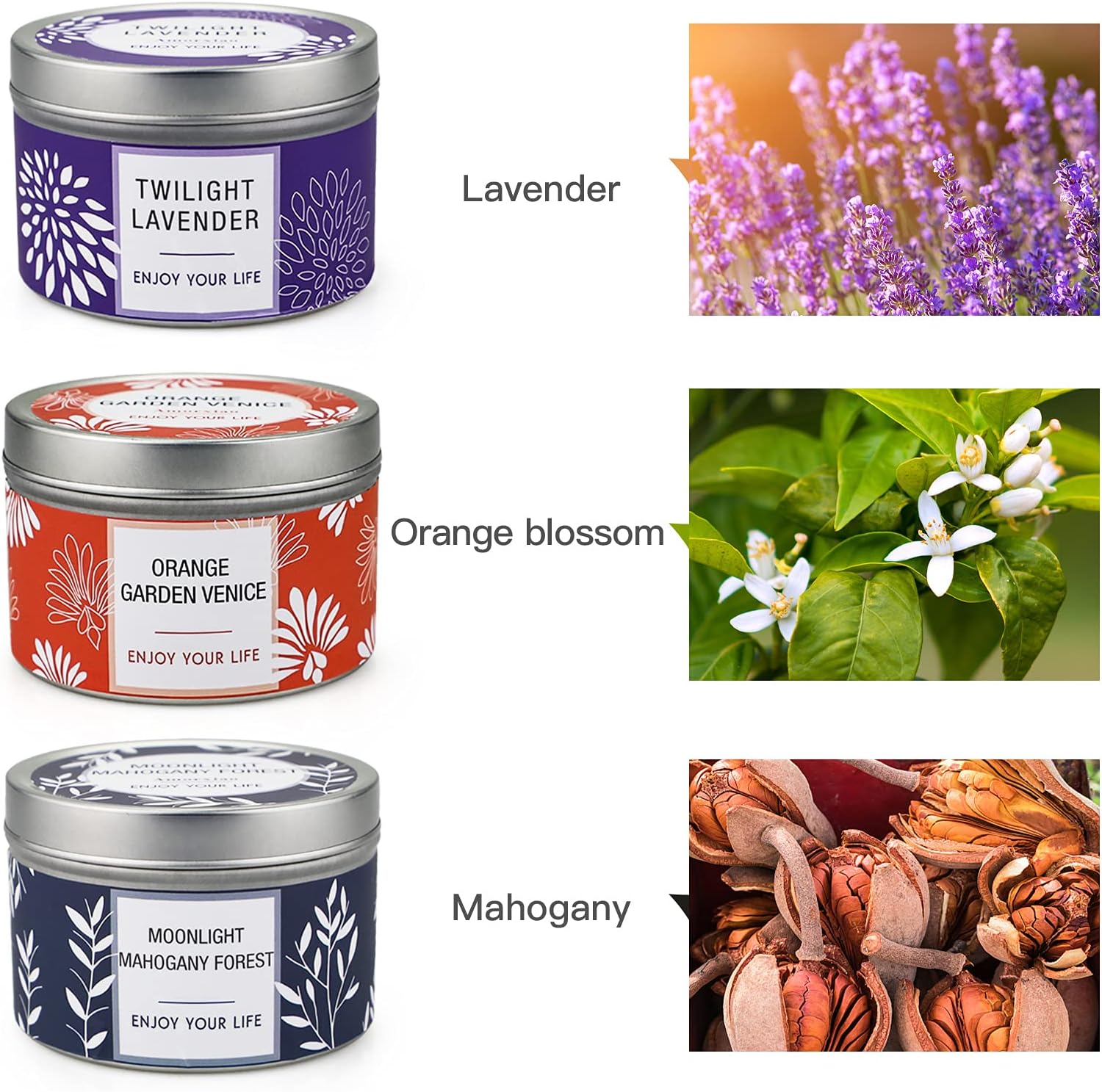 【Long Lasting Candles】The work time of this candle 6.2 oz soy wax candle set is approximately 100 hours. Burns without black smoke, with the lasting fresh fragrance, You can freely enjoy a relaxing time with your family or friends.
