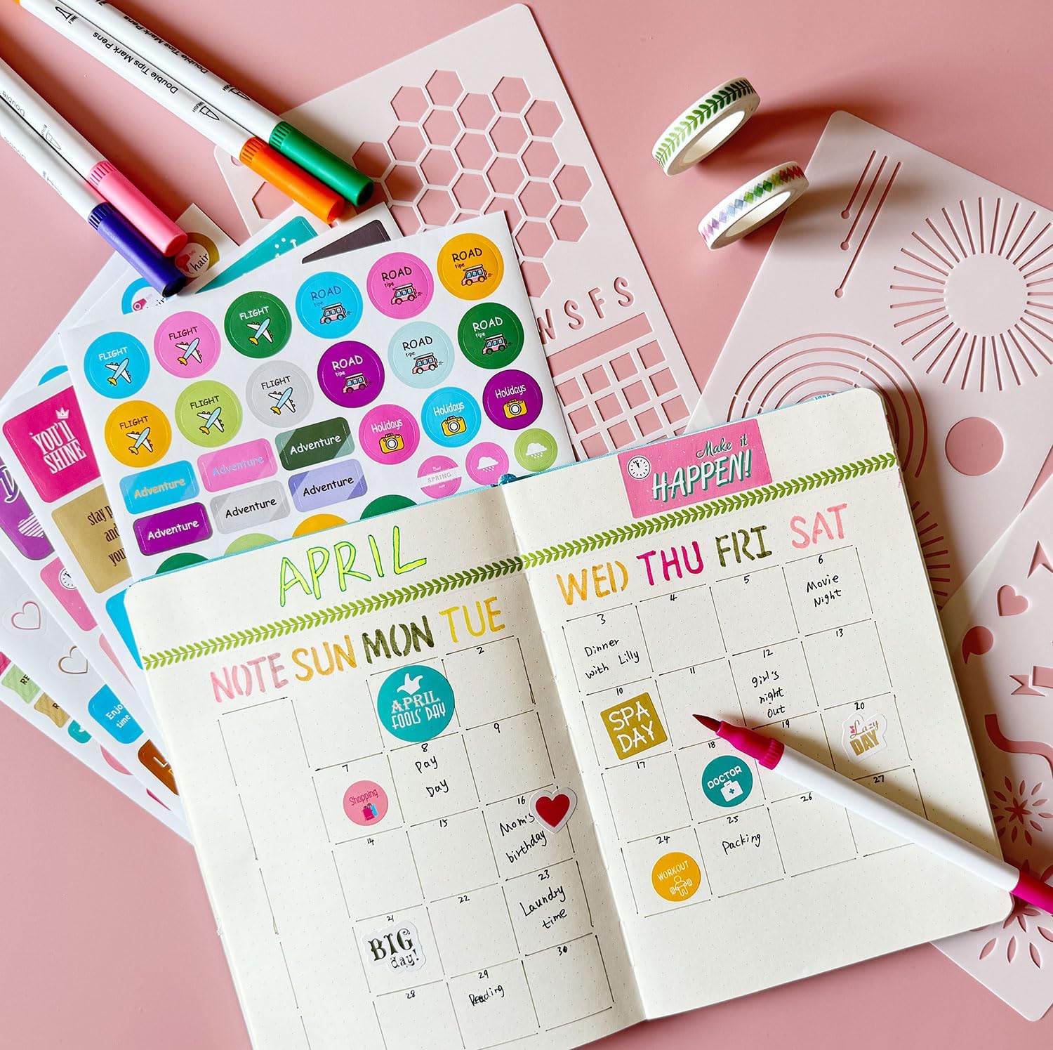 This all-in-one journal starter kit offers everything you need: an A5 hardcover notebook, 12 dual tip markers, 10 reusable journal stencils, 14 planner sticker sheets, 5 washi tapes, and a cute ruler and giftable box.