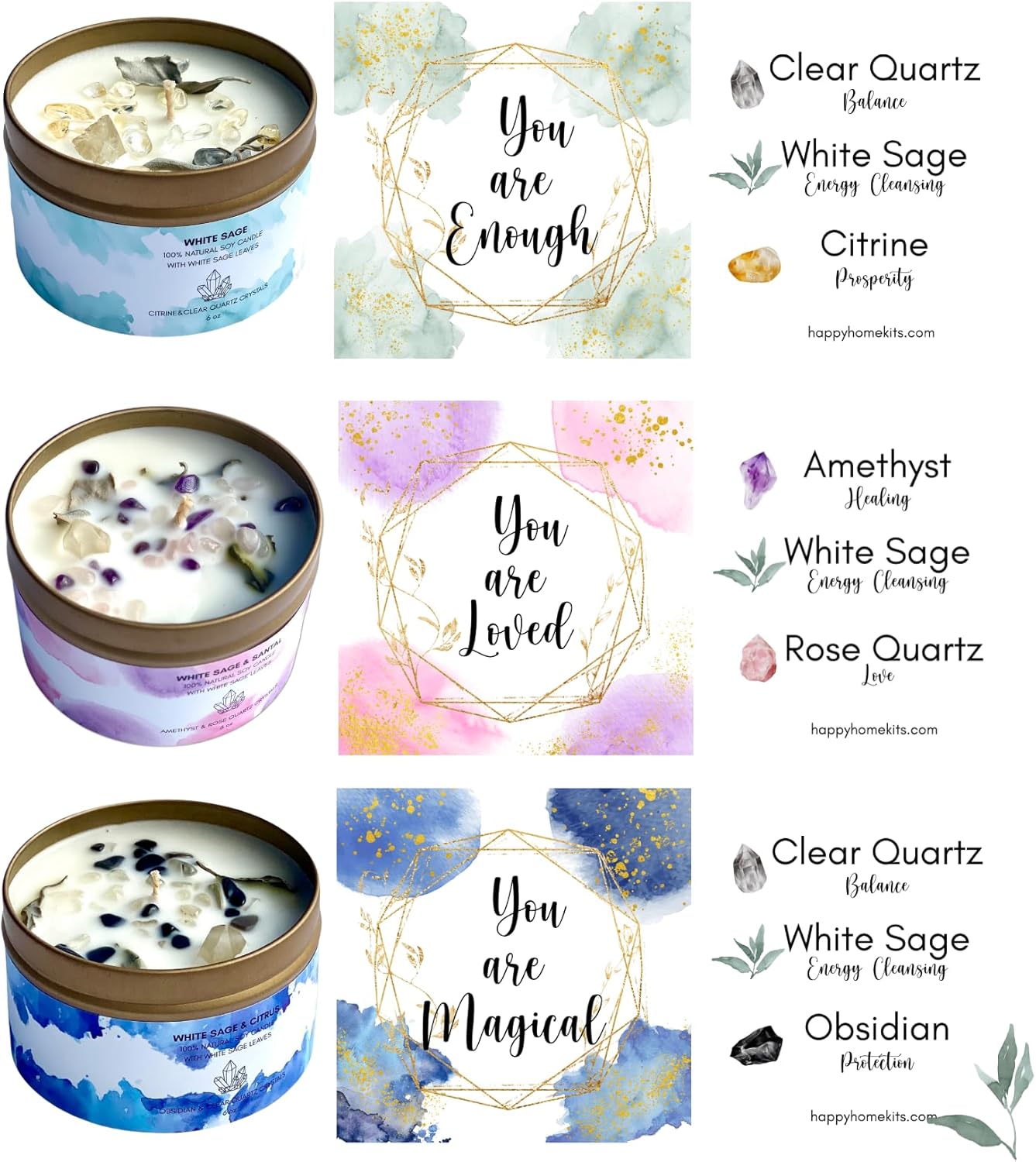 Welcome to a world of abundance and positive vibrations with our White Sage Smudge Candle with Obsidian and Clear Quartz Crystals. Whether used in your home or given to someone special, this candle will surely be a beloved addition to any space.